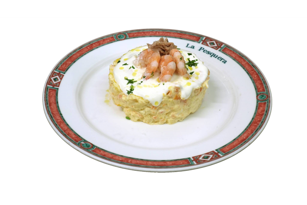 Nuestra ensaladilla rusa con langostinos y aceite de oliva virgen casera es una combinación irresistible de sabores y texturas que te transportará a la tradición culinaria mediterránea. En La Pesquera de San Pedro, hemos elevado esta clásica receta a un nivel superior al agregar langostinos frescos y nuestro propio aceite de oliva virgen casera. Cada cucharada de esta ensaladilla es un deleite para el paladar, donde la cremosidad de la mezcla de patatas, zanahorias y guisantes se realza con la delicadeza y el sabor marino de los langostinos. Nuestro aceite de oliva virgen casera aporta un toque final de exquisitez, resaltando los sabores y aportando una suavidad inigualable. Disfruta de esta ensaladilla rusa única en nuestro restaurante en el paseo marítimo de San Pedro Alcántara y déjate llevar por los sabores auténticos y caseros que ofrecemos.